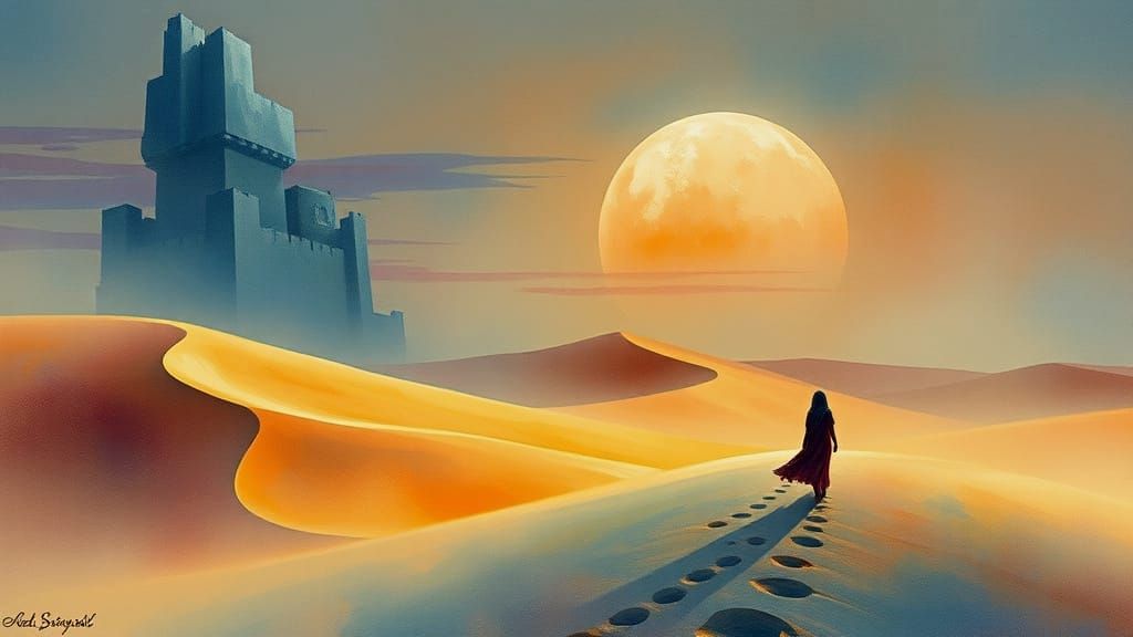 This image depicts a Bedouin woman standing in a surreal, jewel-toned oasis, surrounded by sand dunes and infused with a sense of otherworldly expressionism, reminiscent of Zdzisลaw Beksiลski's works.