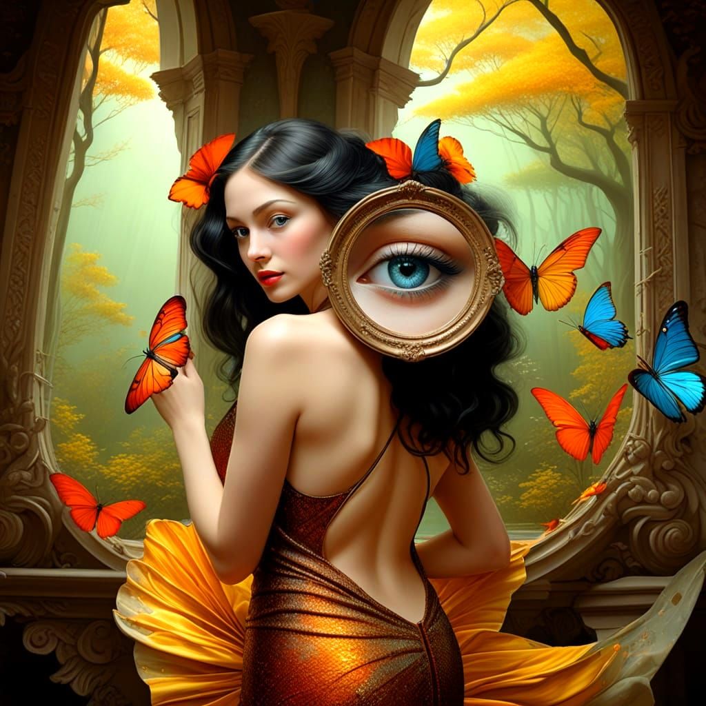 beautiful mature ladies, fantastic surreal image, mirrors, water surface, reflections, vibrant luminous colors, intense contrasting colors, sharp focus, great focal depth, highly detailed, high definition, ultra quality, fantasy, illusion, paradox, mystery, surrealism, photorealism, hyperrealism, minimalism, ...