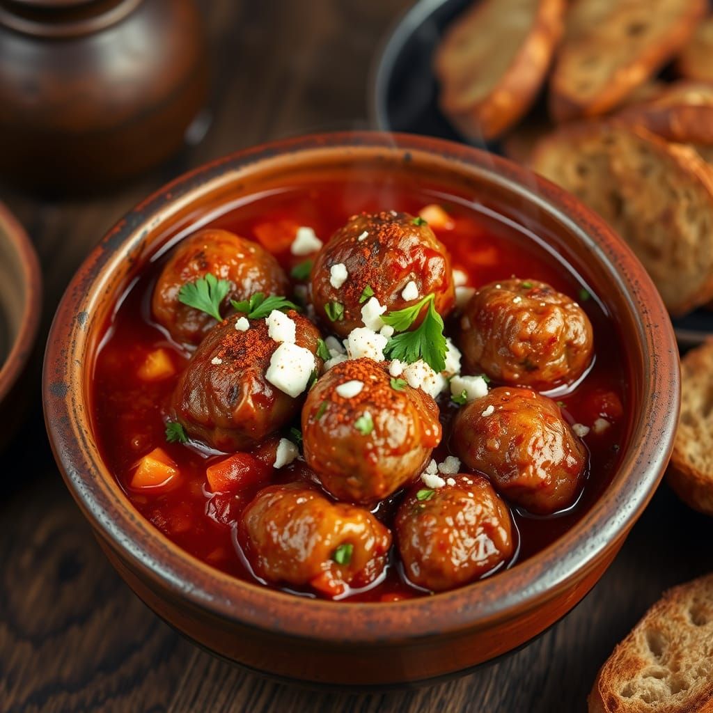 A close-up of a delicious asado dish with meatballs in tomato sauce. The still life features warm, dramatic lighting and rich colors, reminiscent of classic Spanish paintings.