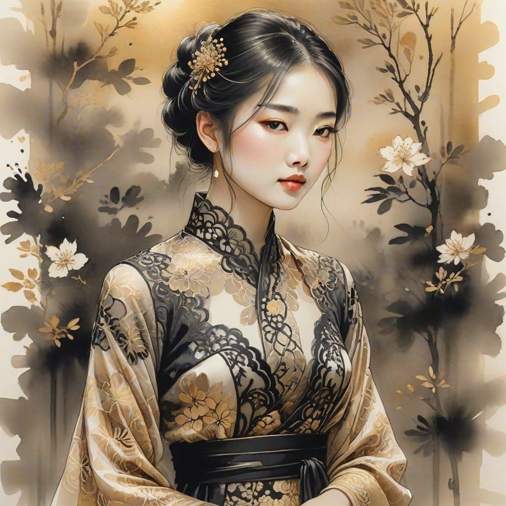 This image shows a beautiful woman wearing elaborate lace in a traditional Japanese sumi-e style ink painting. The artwork features delicate black ink lines and a soft, muted watercolor background.