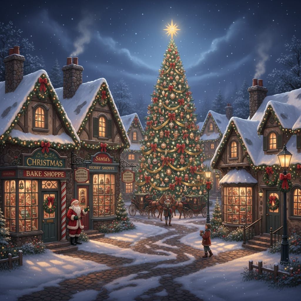 This image depicts a charming Christmas village filled with decorated shops and houses. A tall, illuminated Christmas tree stands at the center, creating a magical, inviting atmosphere in a detailed illustrative style.