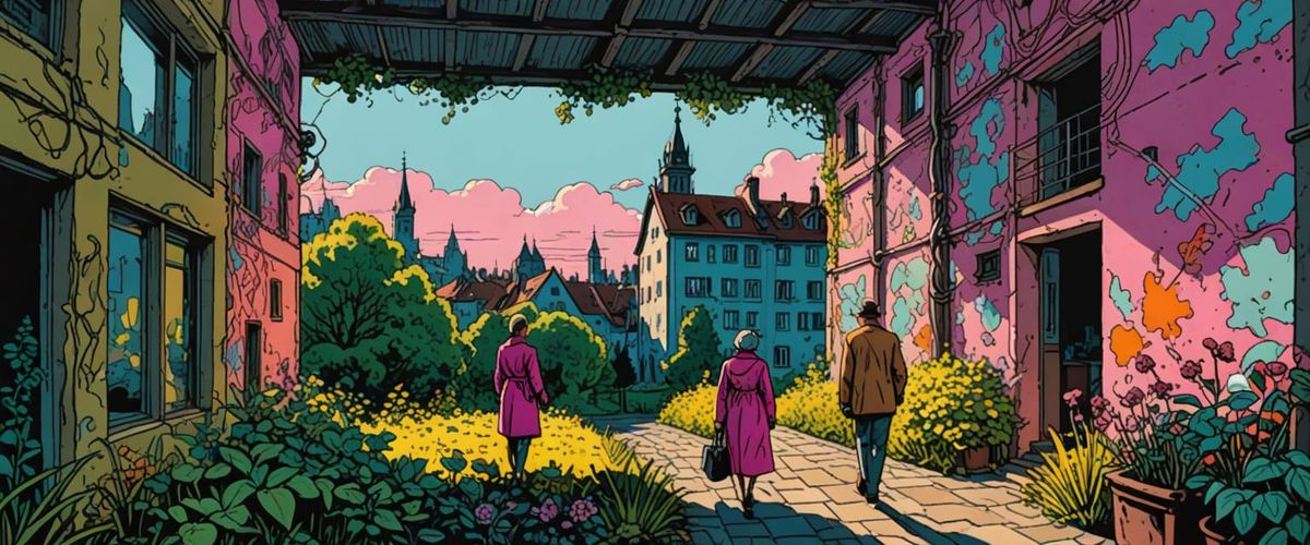 This image shows a couple exploring an abandoned factory district with colorful graffiti. The scene is reminiscent of comic art, with vibrant colors, watercolor textures and a Ghibli aesthetic. The lighting is volumetric, with a chiaroscuro effect.