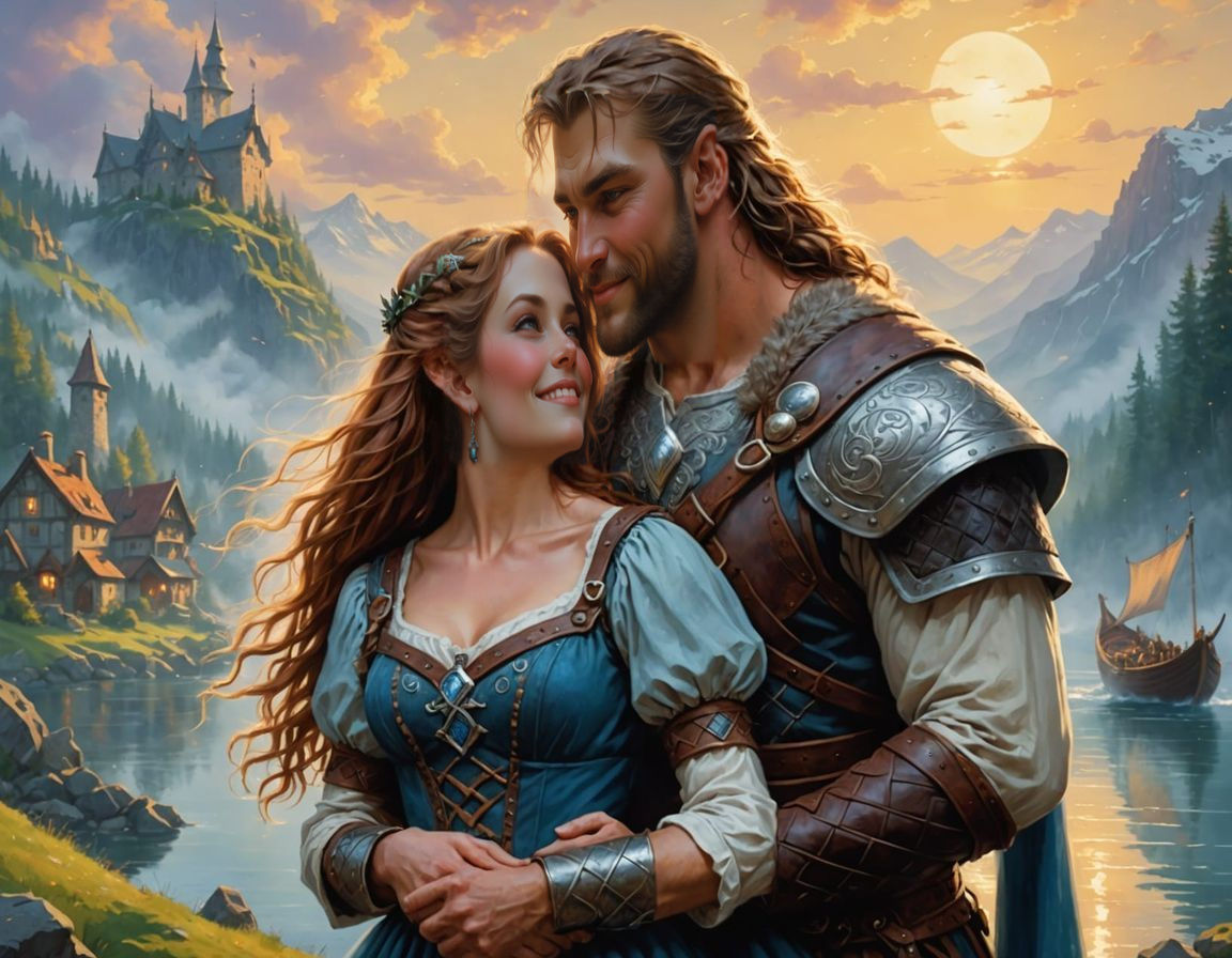 "A handsome Viking man holding a most beautiful woman in his arms. they are lovingly looking at each other. They are smiling at each other. Realistic painting. ethereal fantasy hyperdetailed mist Thomas Kinkade"