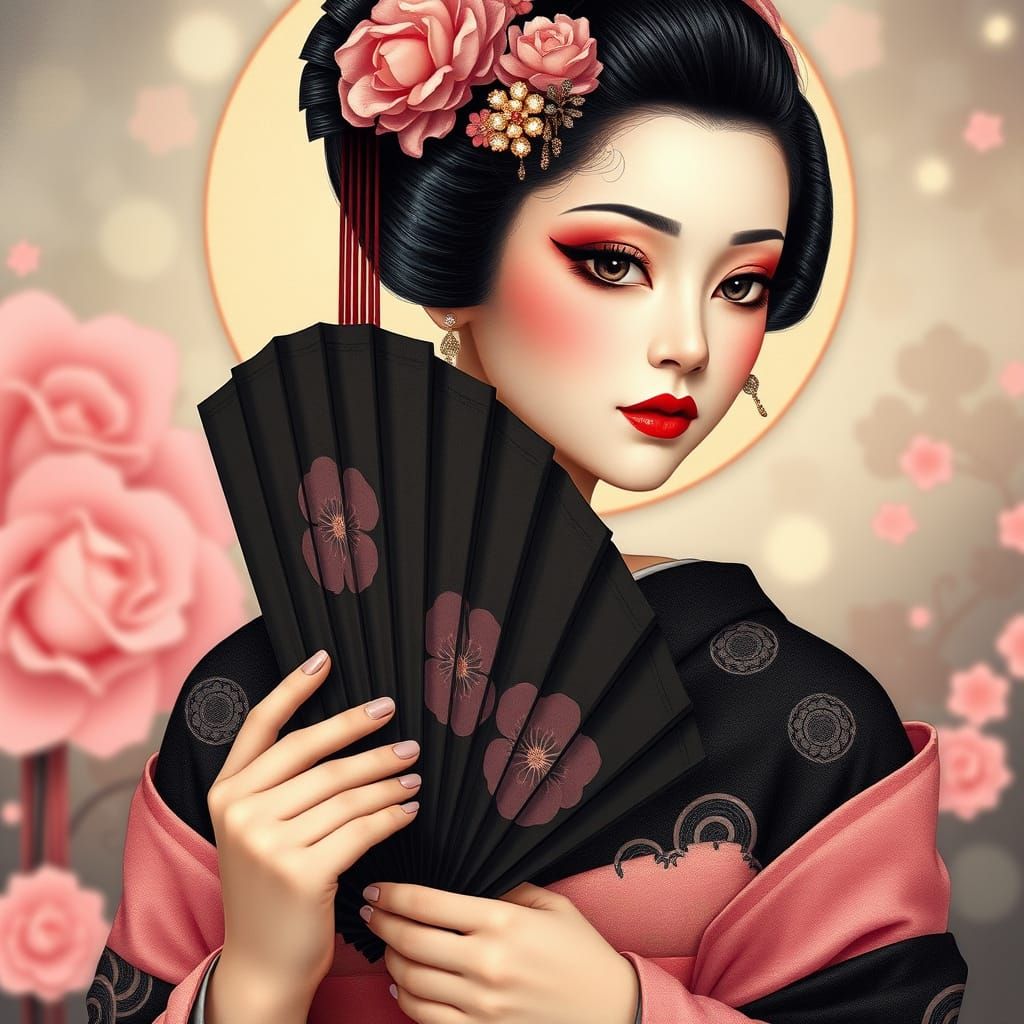 A striking picture of a geisha in black and pink clothing, holding a fan. The image is reminiscent of art nouveau, with vibrant colors and delicate lines in a photorealistic style.