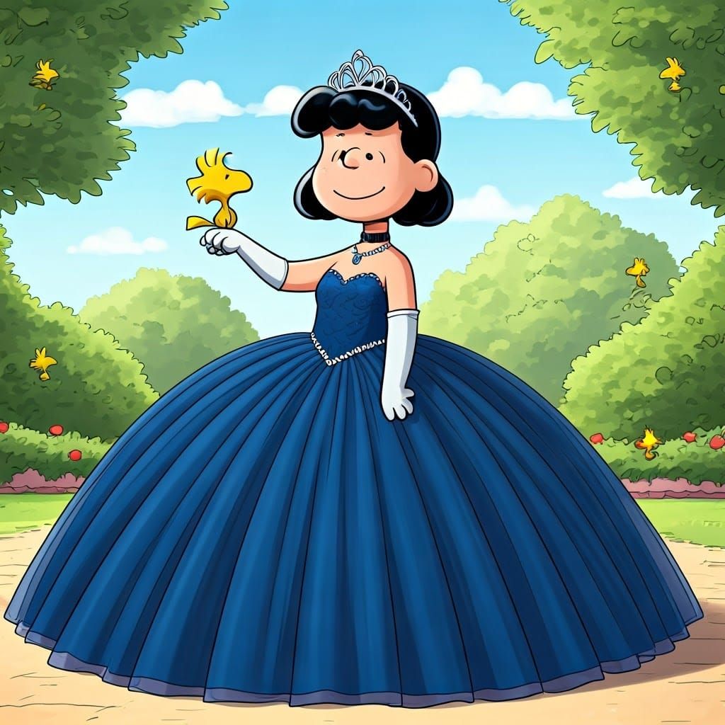 Peanuts 2d Cartoon Style: Lucy Van Pelt wearing a long large floor length royal blue tulle Sleeveless poofy quinceanera ball gown. The dress has a sweetheart neckline and is embellished with rhinestones. She is also wearing a tiara, long white gloves, and a dark blue choker necklace. Woodstock is on ...