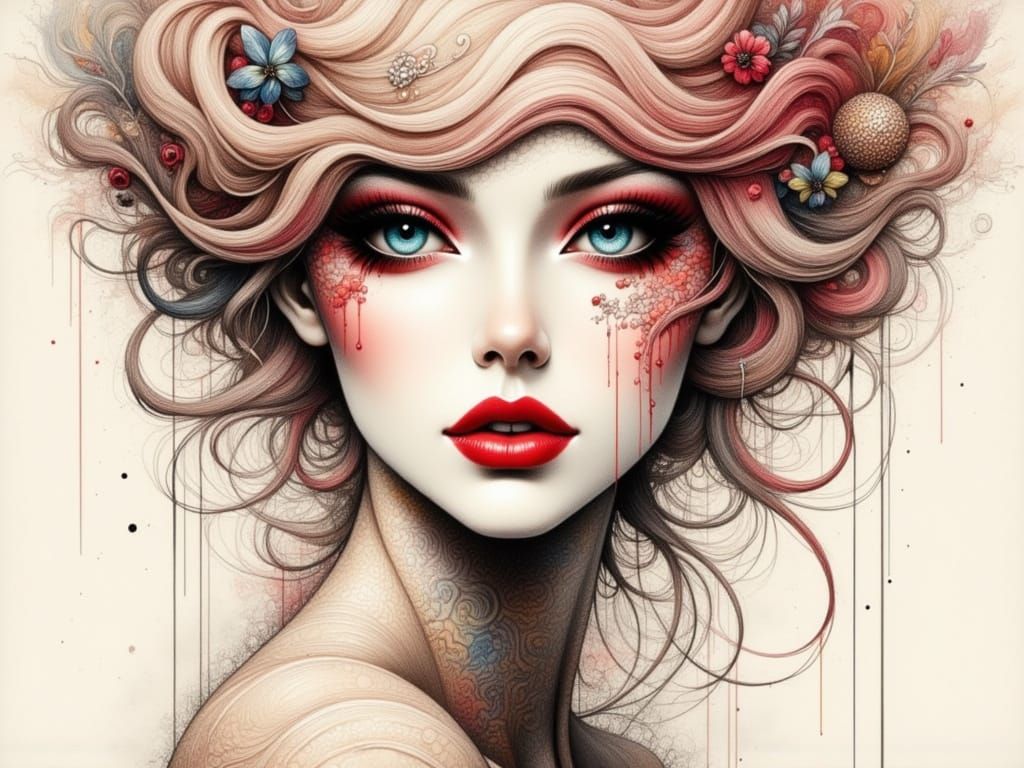 A portrait of a woman with red lips and blue eyes against a cream backdrop. The artwork blends ink, charcoal, and watercolor in swirling patterns, with pastel and bold color contrasts in a surrealist pop style.
