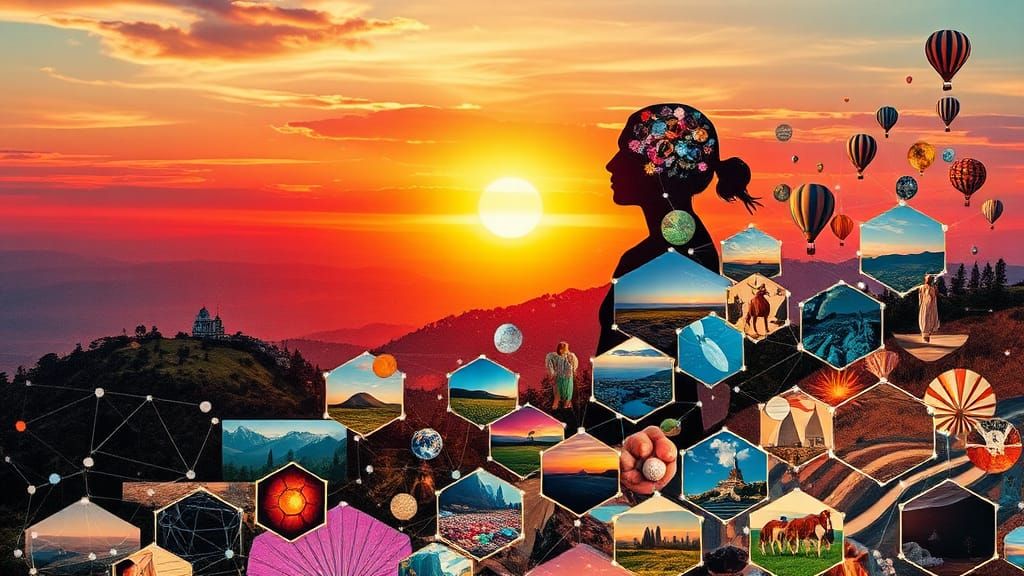 A digital collage art piece depicting a glowing human figure connected to nature. The artwork blends bio art with abstract designs and vivid colors to evoke feelings of self-improvement and resilience.