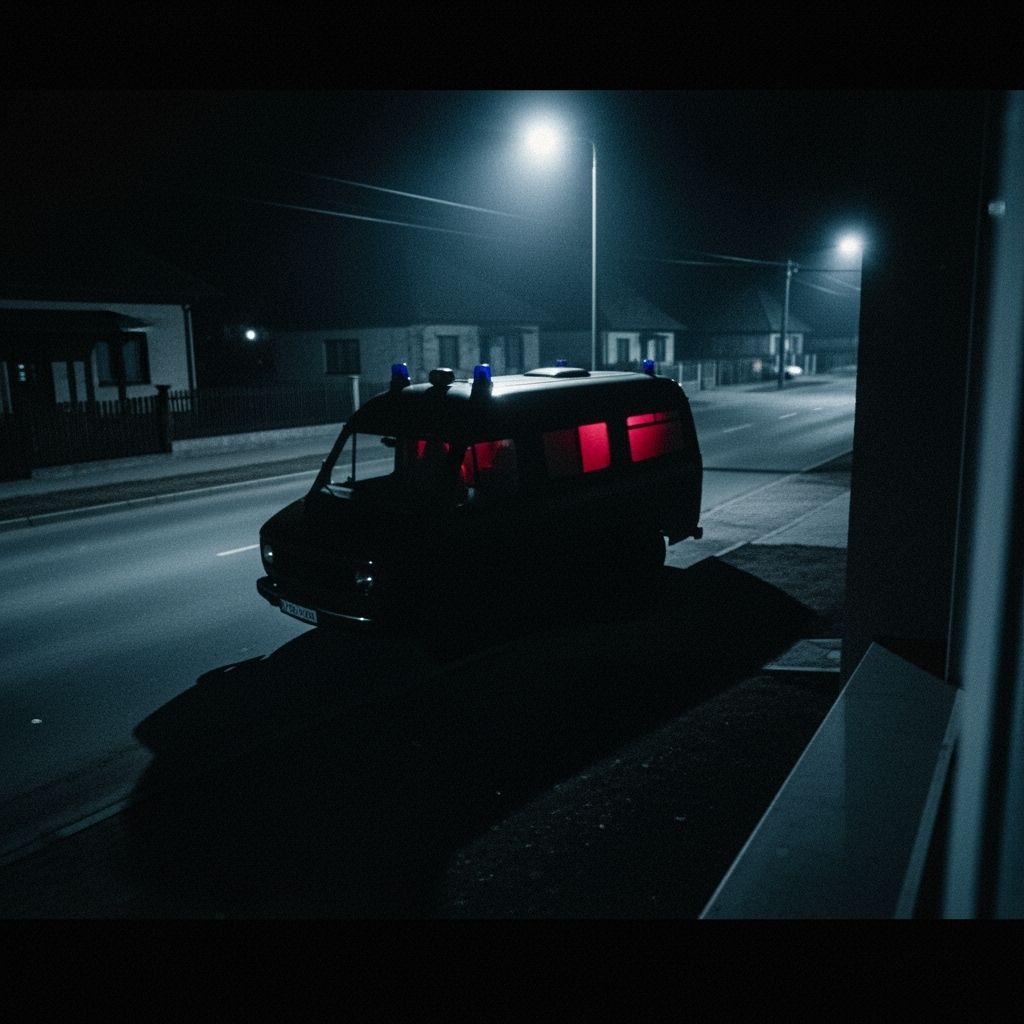 This image shows an unmarked black ambulance parked on a suburban street at night. It's reminiscent of grainy, low-resolution VHS recordings with an unsettling, creepy, and eerie 80s aesthetic.