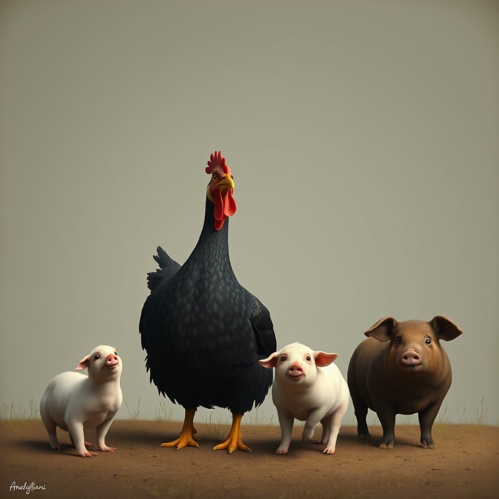 This image shows a serene collective farm where animals live in harmony. A chicken's quack echoes through the landscape, surrounded by plump piglets and a contented mother. The scene is reminiscent of a peaceful, idyllic rural setting, with a nod to the works of 20th-century figurative artists and stop-m...