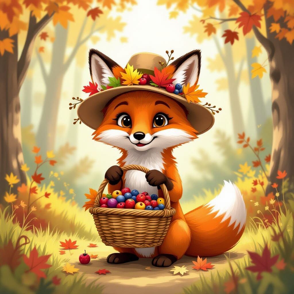 This whimsical illustration features a happy fox with a hat made of leaves and twigs, carrying a basket of berries in a sunlit forest clearing. Rendered in a soft, painterly storybook style.