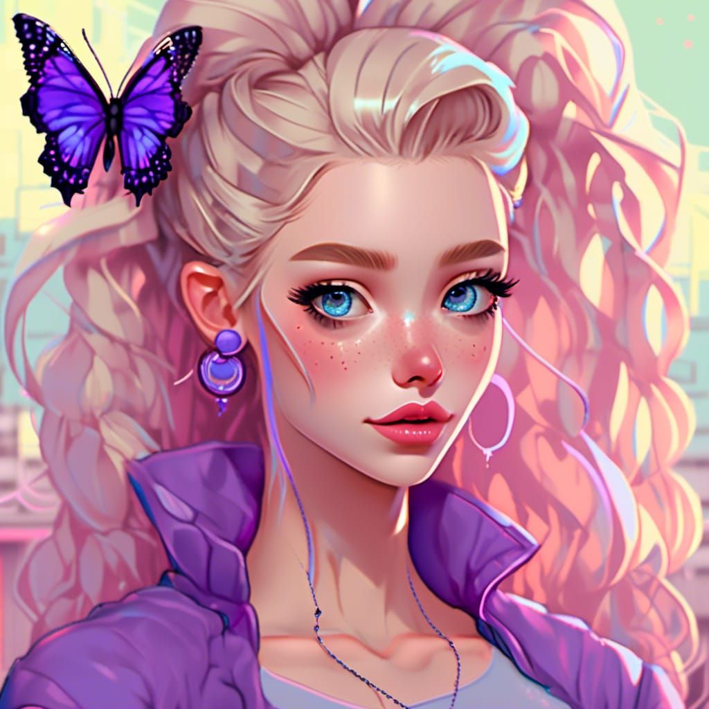 This image shows a young woman with blonde hair and icy blue eyes, adorned with purple earrings and butterflies. She is depicted in a cyberpunk aesthetic with neon accents.