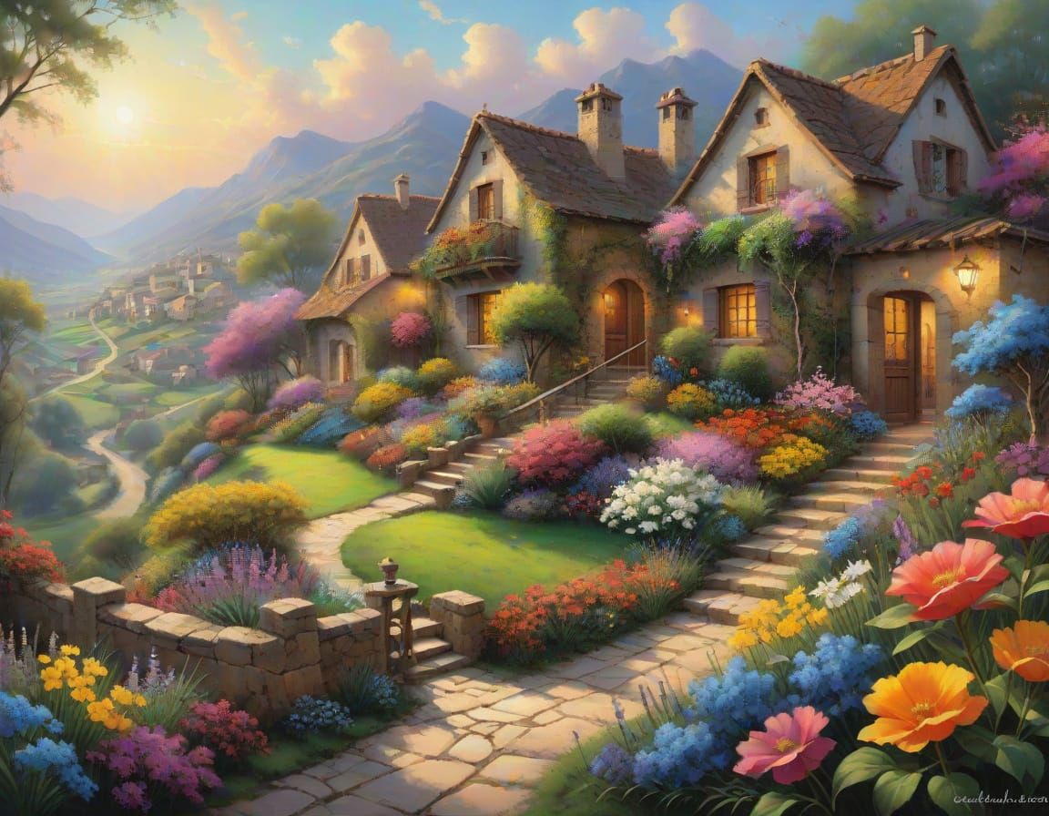 This idyllic painting depicts a peaceful village surrounded by lush gardens and vibrant flowers, bathed in warm, soft light and soft pastel colors, with intricate architectural details and a dreamy, ethereal atmosphere.