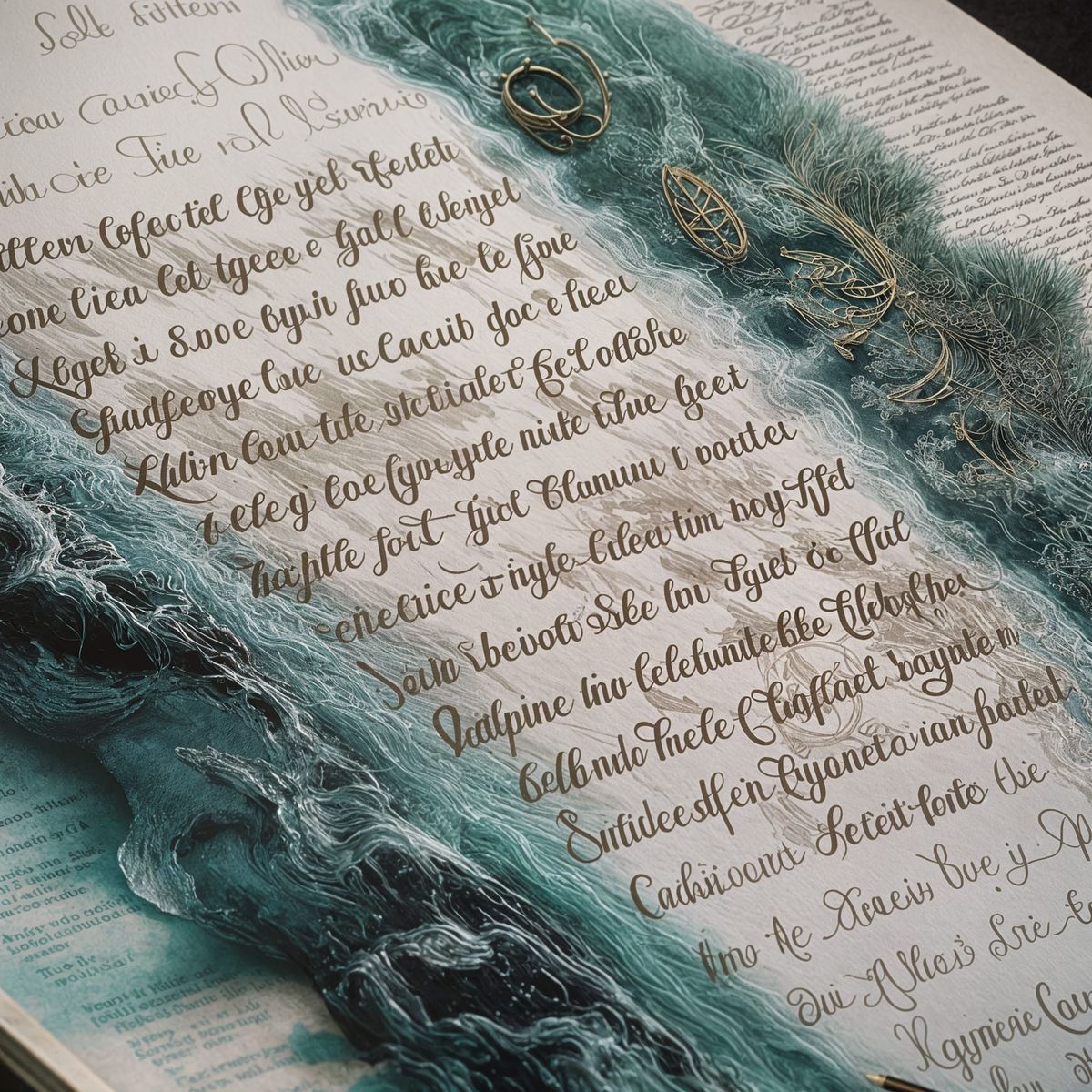This image shows a hyperrealistic artwork of calligraphy on a decorated page. An intricate underwater marine landscape embellishes the page, creating a harmonious blend of art and literature.