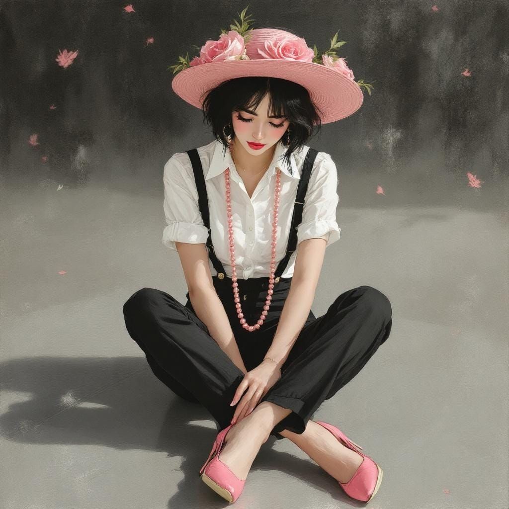 A soft impressionism, soft brush strokes oil, painting of a lady with a black hair wearing a pink hat with a pink rose around the rim, she is looking down, pink lips, Rosie cheeks, wearing a white button up dress shirt, black dress pants with suspenders, pink earrings, a long strand of pink pearls around ...