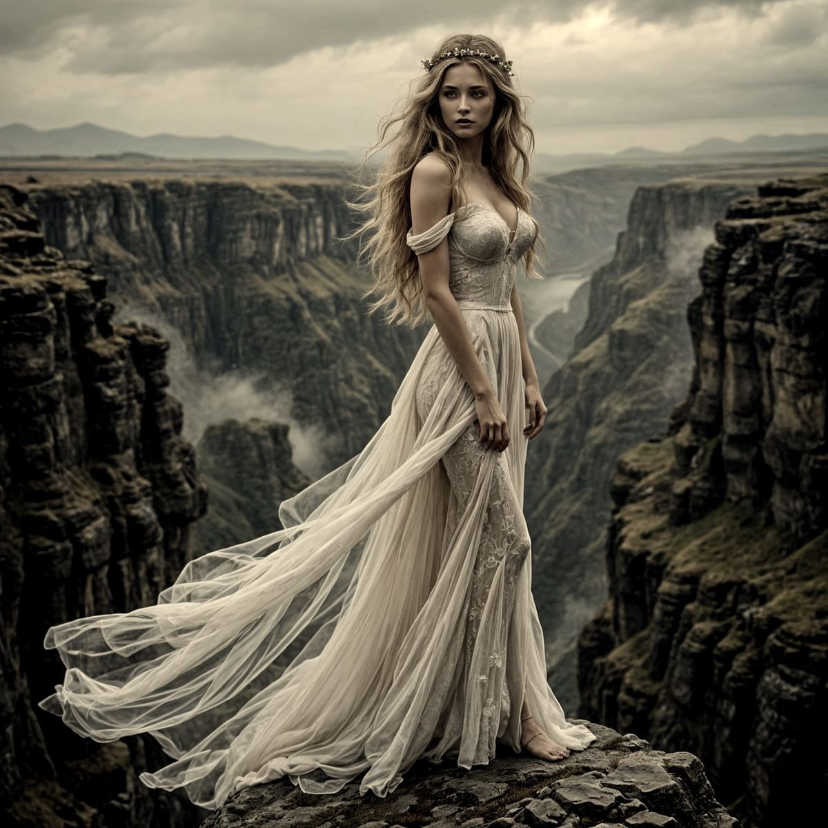 This image shows a sorrowful woman with long hair standing at the world's edge. The portrait captures her beauty with realistic detail and a melancholic mood.