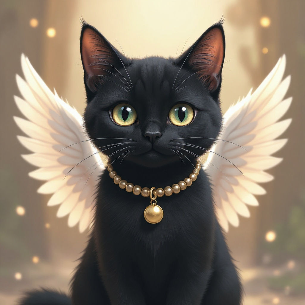 This image shows a black cat with angel wings and a gentle expression. The heartwarming digital artwork portrays the feline with an aura of serenity.