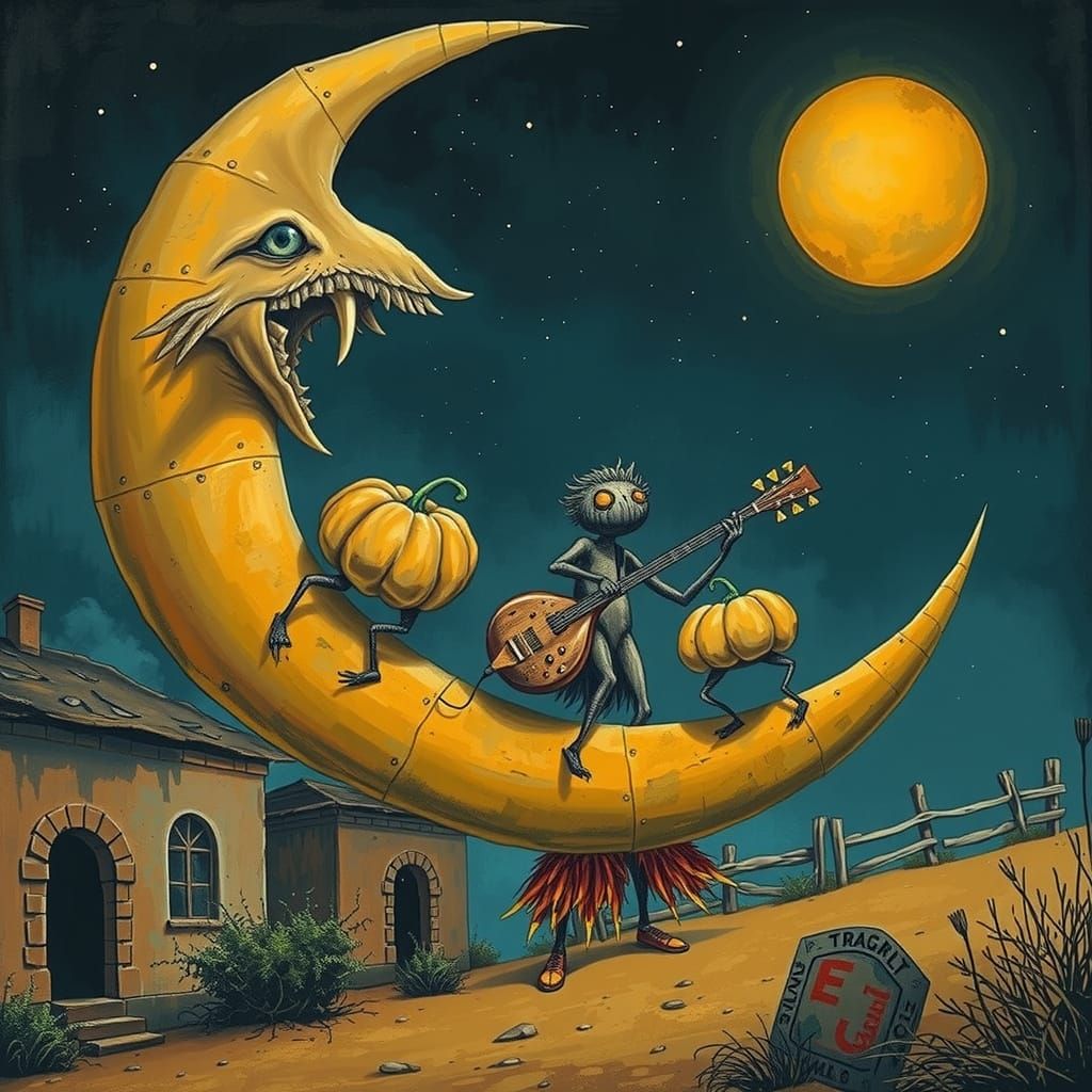 This surreal painting depicts a fantastical creature playing a guitar in a dreamlike landscape. The creature's punk-rock inspired look and eggplant-hued body contrast with its vibrant shoes. Rendered in a style reminiscent of Albrecht Dürer's woodcuts, with bold lines and Renaissance influences.