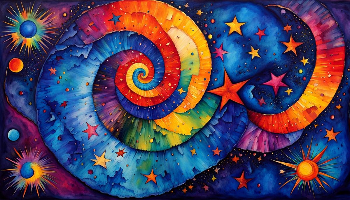 Giant Stars of different shapes, sizes and colors are falling into the center of a spiral vortex of Stars, large Stars are flying all around, alcohol ink watercolor painting in vivid colors on deep blue background., Miro, Kadinsky ink watercolor painting in vivid colors, Miro, Kadinsky-impressionism ...