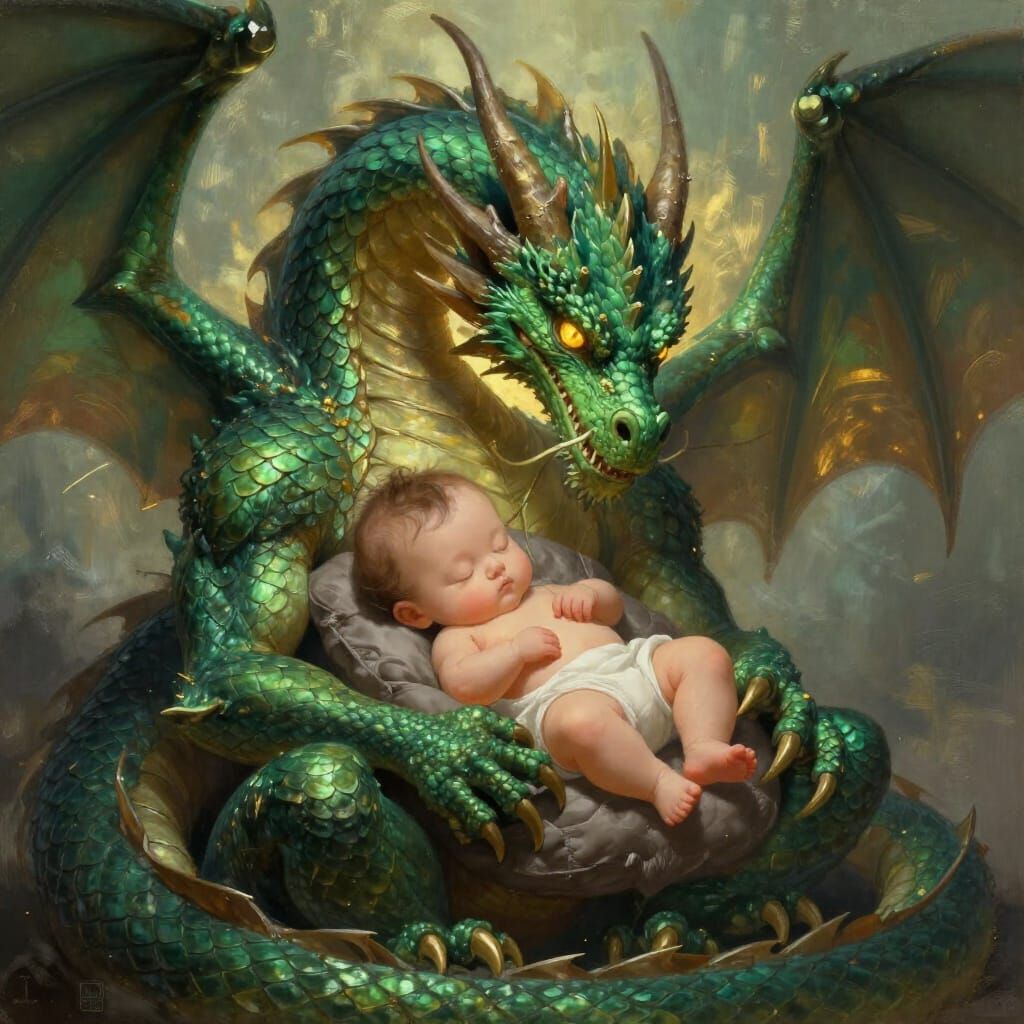 This image shows a large, green dragon gently holding a baby in its claws. Warm light shines from the dragon's eyes, creating a protective atmosphere. Rendered with painterly textures and dramatic lighting.