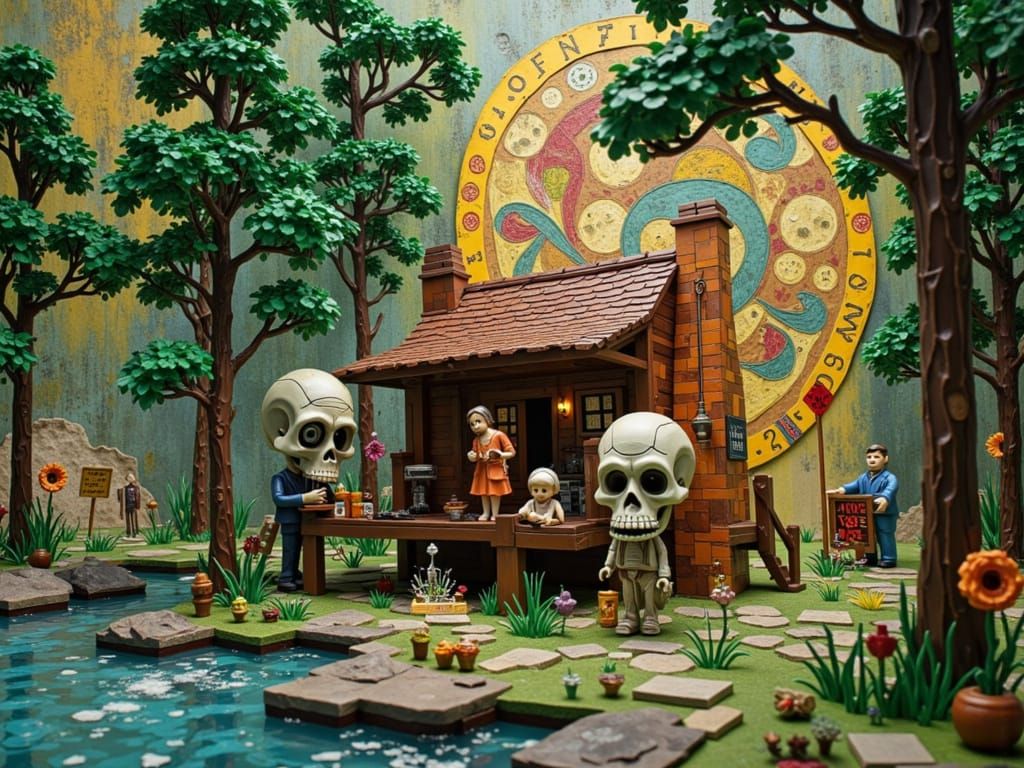 This image depicts detailed claymation families enjoying a vacation at a forest lodge. It features vibrant mathematical equations rendered in alcohol ink with black outlines, evoking a surreal and whimsical artistic style.