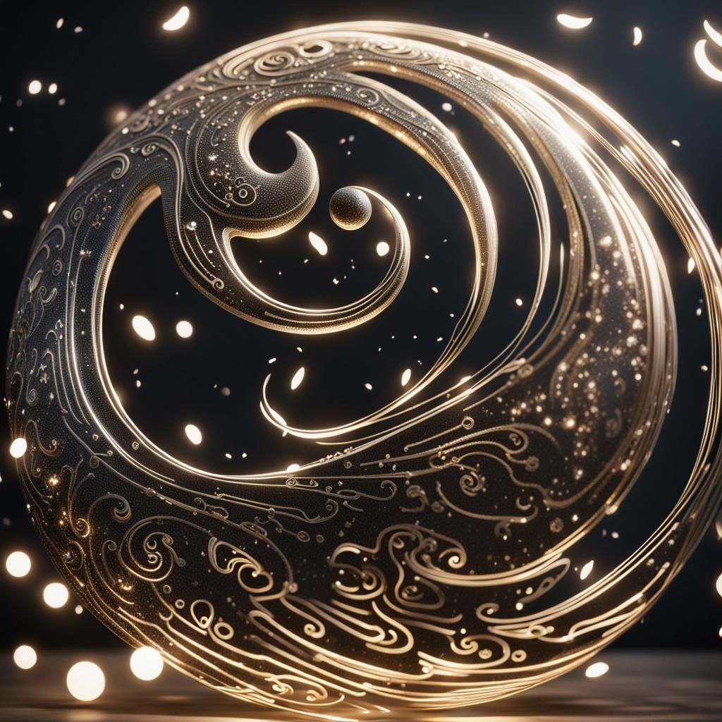 This image shows a detailed, swirling ying-yang symbol suspended in air. Fine details and photorealistic textures create a visually striking 3D rendered image with dramatic lighting.