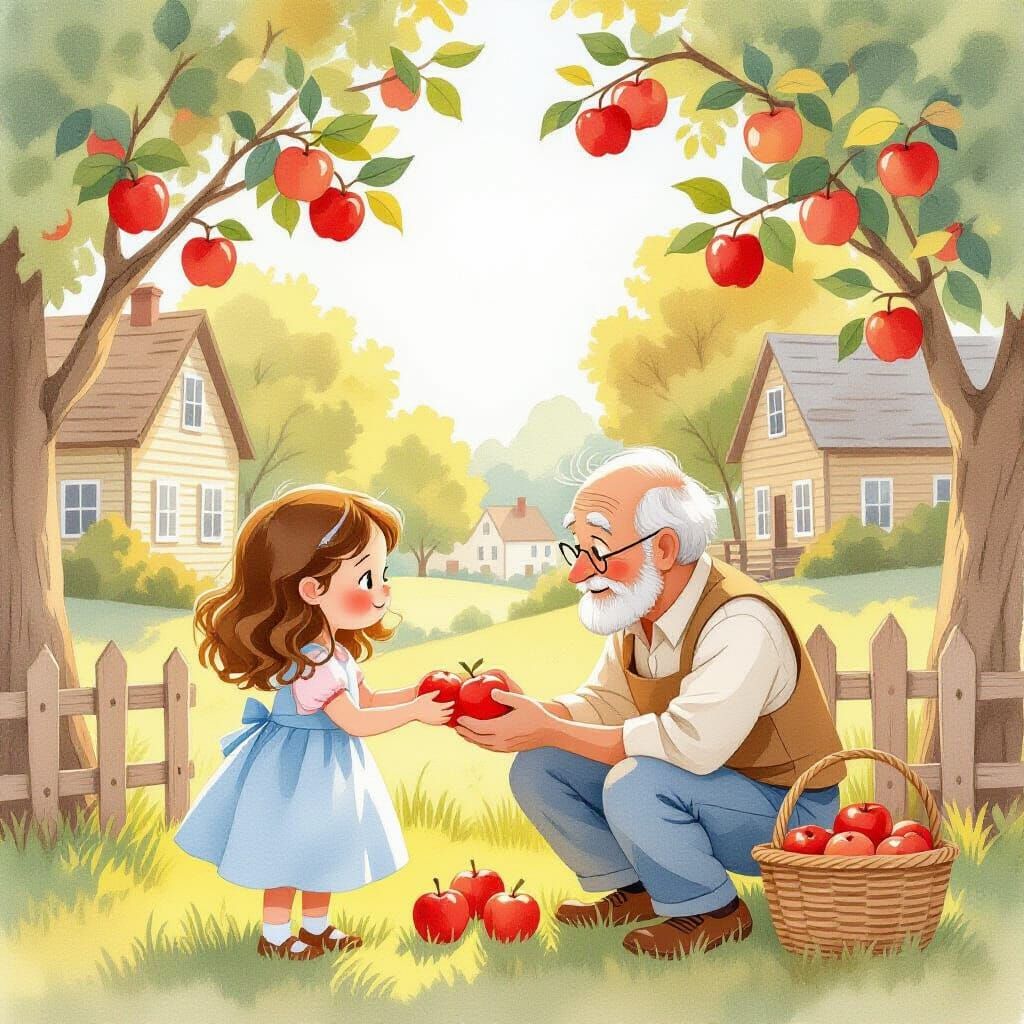 This image shows a heartwarming watercolor illustration of a young girl assisting an elderly man with apple picking in a quaint town. Features gentle watercolors and soft outlines.