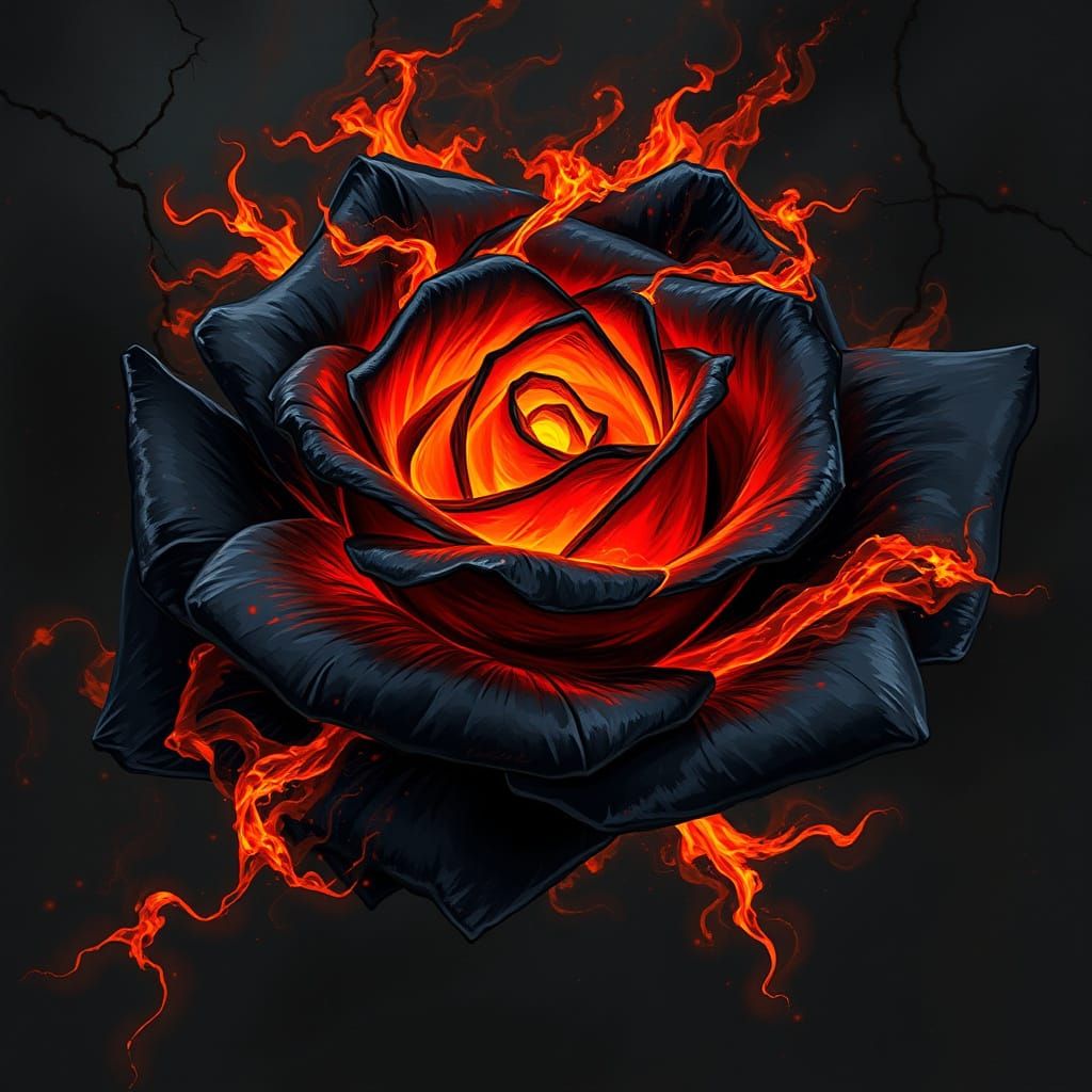 This image depicts a majestic, fiery rose with swirling, molten petals against a dark, smoldering background, evoking a sense of ancient power and mysticism, blending realism and fantasy with intricate details and textures.
