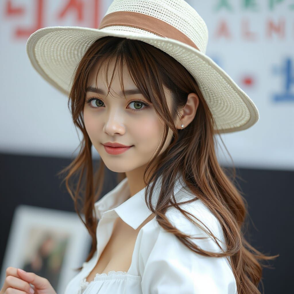 This image showcases a solo female K-pop artist. She has long brown hair, green eyes, and wears a white sun hat and dress. The portrait, focused on the upper body, features exceptional detail and a blurred background.