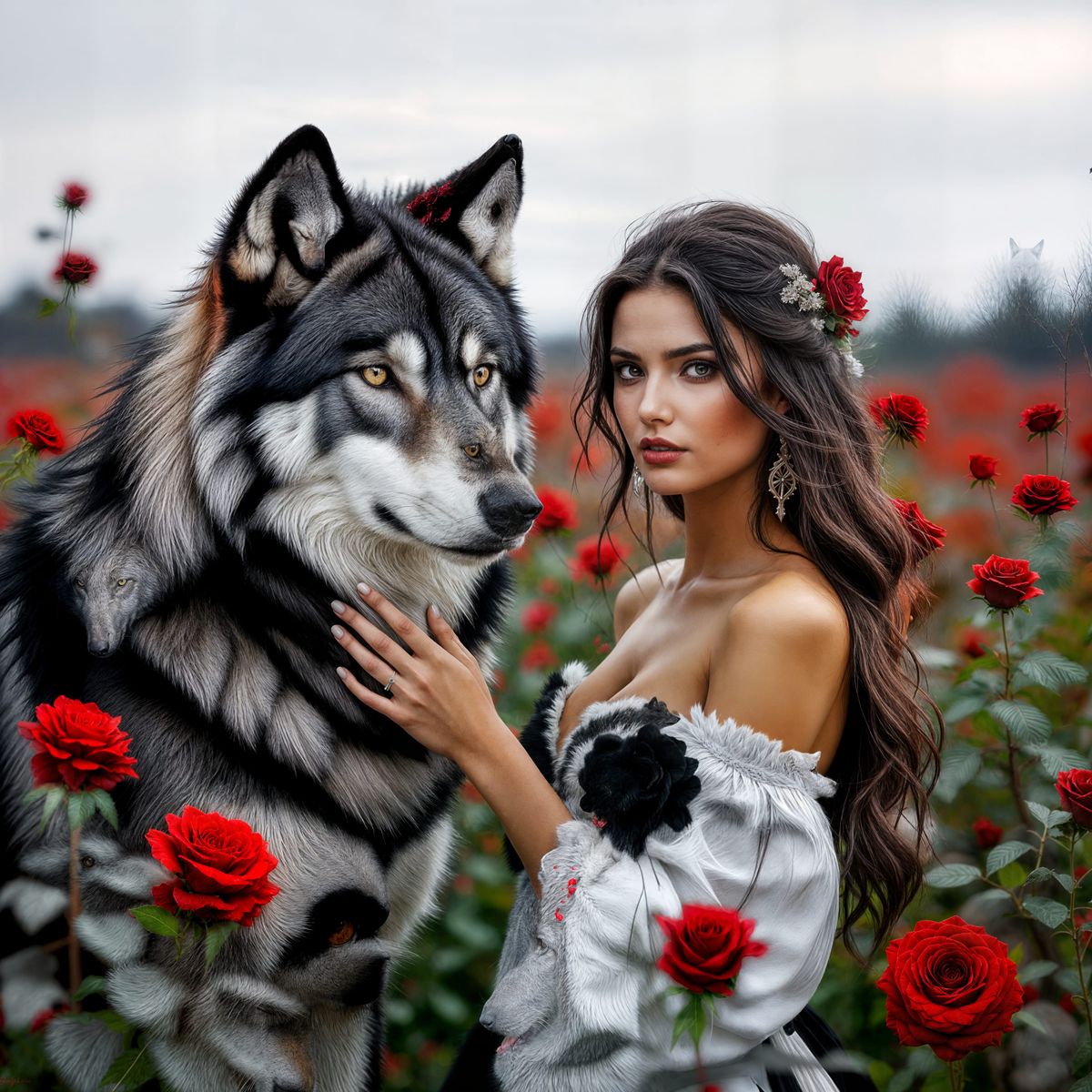 This image depicts a majestic black and grey wolf standing beside a fierce, beautiful woman in a striking field of black and red roses.