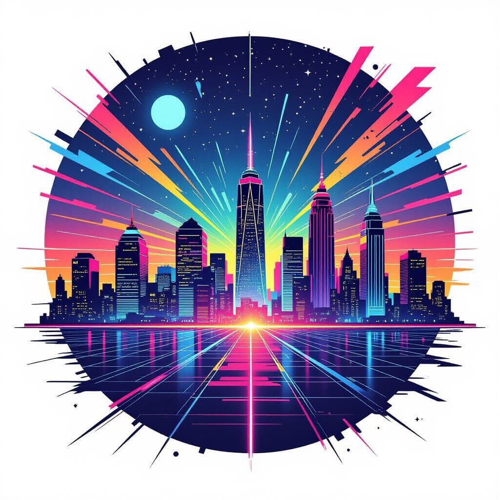 This image shows a vibrant, retro-futuristic cityscape at night, reminiscent of 1980s airbrush art. The design features neon lights, geometric shapes, and bold colors, capturing the energy of synthwave aesthetics.