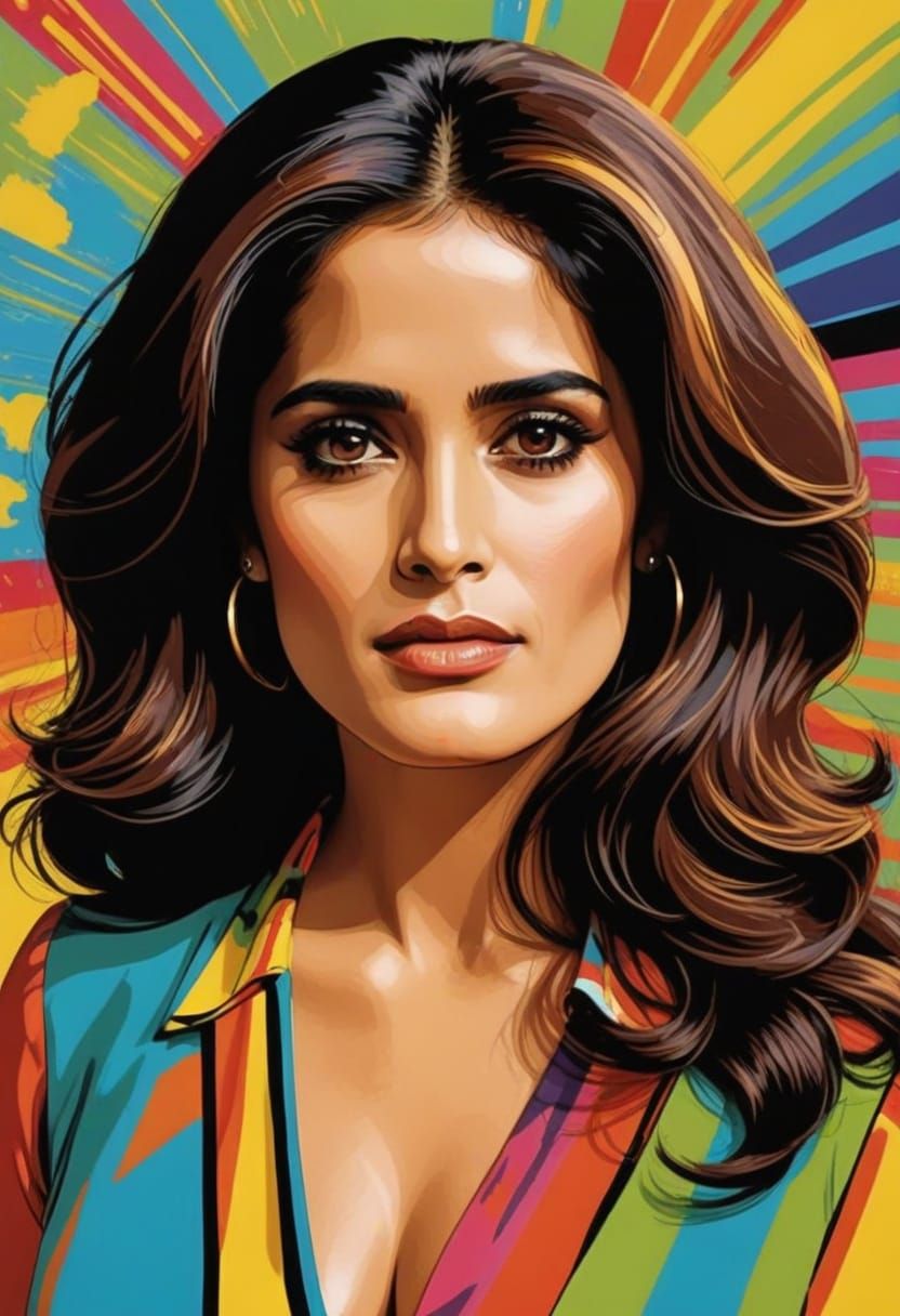 This image shows Salma Hayek rendered in a pop art style. The artwork evokes the style of mid-century comic book art, using vibrant tetradic colors and Ben-Day dot printing techniques.