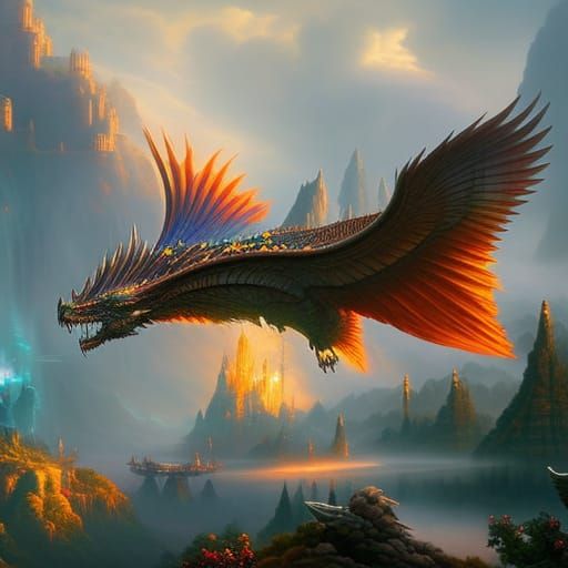 A vibrant dragon soars through the sky in this digital fantasy artwork. The image features intricate details, dramatic lighting, and a rich color palette, rendered as concept art in 8k resolution.