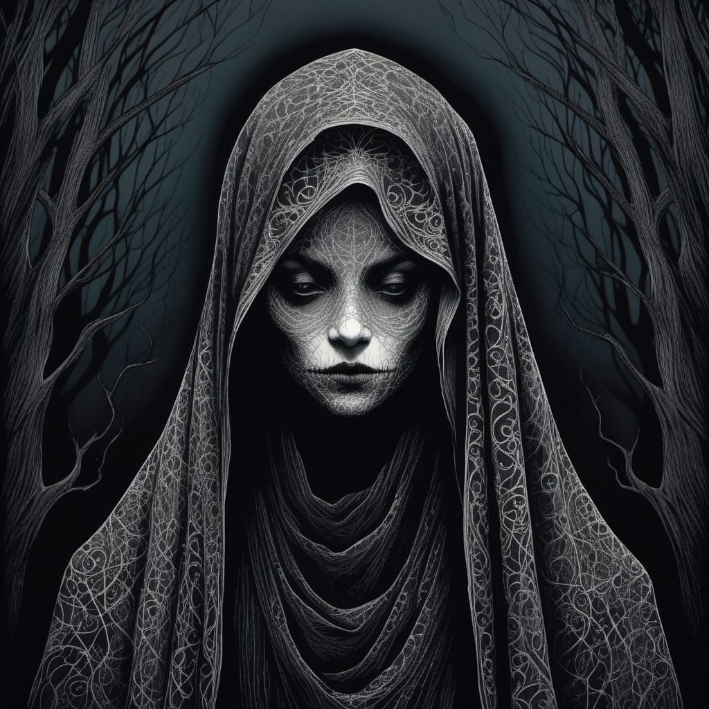This image features a haunting, gothic-inspired portrait of a mysterious veiled woman. It showcases delicate lines and eerie, moonlit shading, reminiscent of classic illustrative styles.