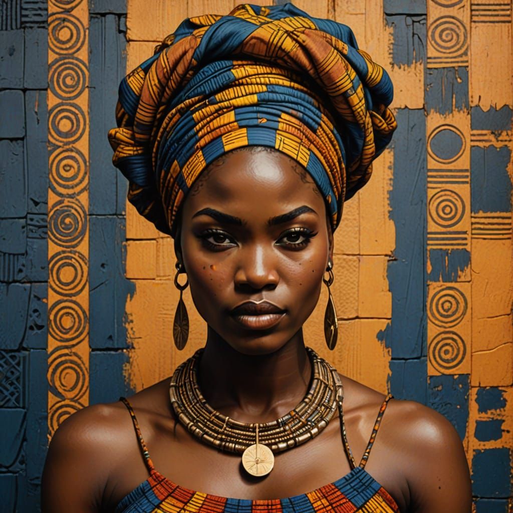 This image features a young woman with long braided hair and a colorful head wrap, inspired by traditional Yoruba art with intricate patterns and earthy tones.