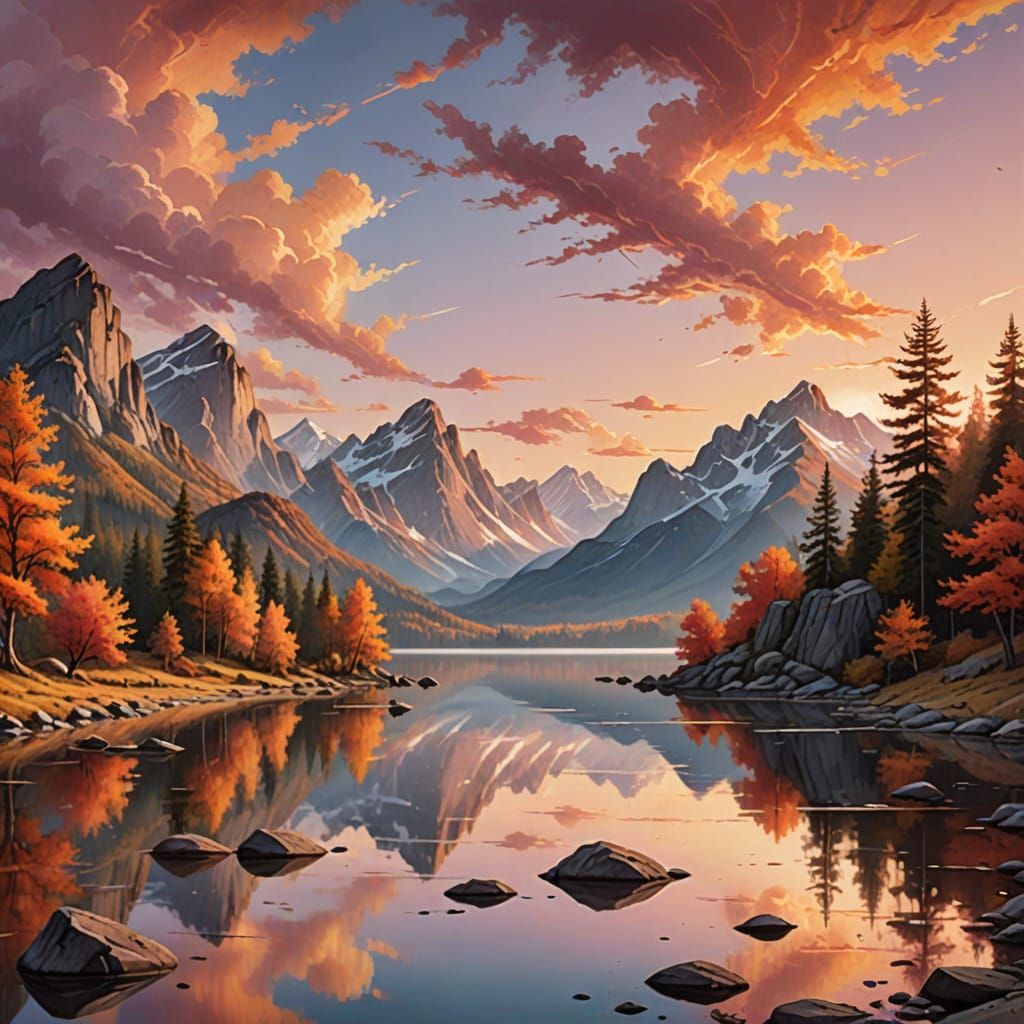 This serene digital painting captures a tranquil lake surrounded by vibrant autumn foliage, reflecting warm golden light and soft wispy clouds in a cinematic 4k landscape.