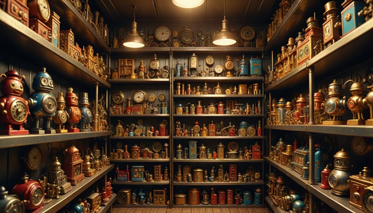This image shows a shop filled with shelves of vintage clockwork tin toys. The intricate toys are bathed in warm, golden light, creating a nostalgic atmosphere. The image is rendered with detailed textures and rich colors.