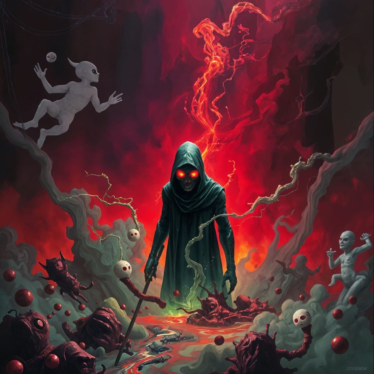 A complex, surreal image depicting a struggle within the mind. The art style is abstract and symbolic, representing inner turmoil.