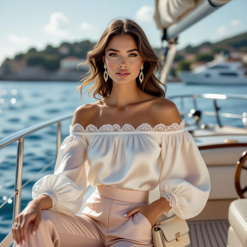 A captivating image of a woman on a yacht, showcasing an elegant ivory blouse and blush trousers. The scene evokes a sun-kissed, high-fashion aesthetic reminiscent of classic photography.