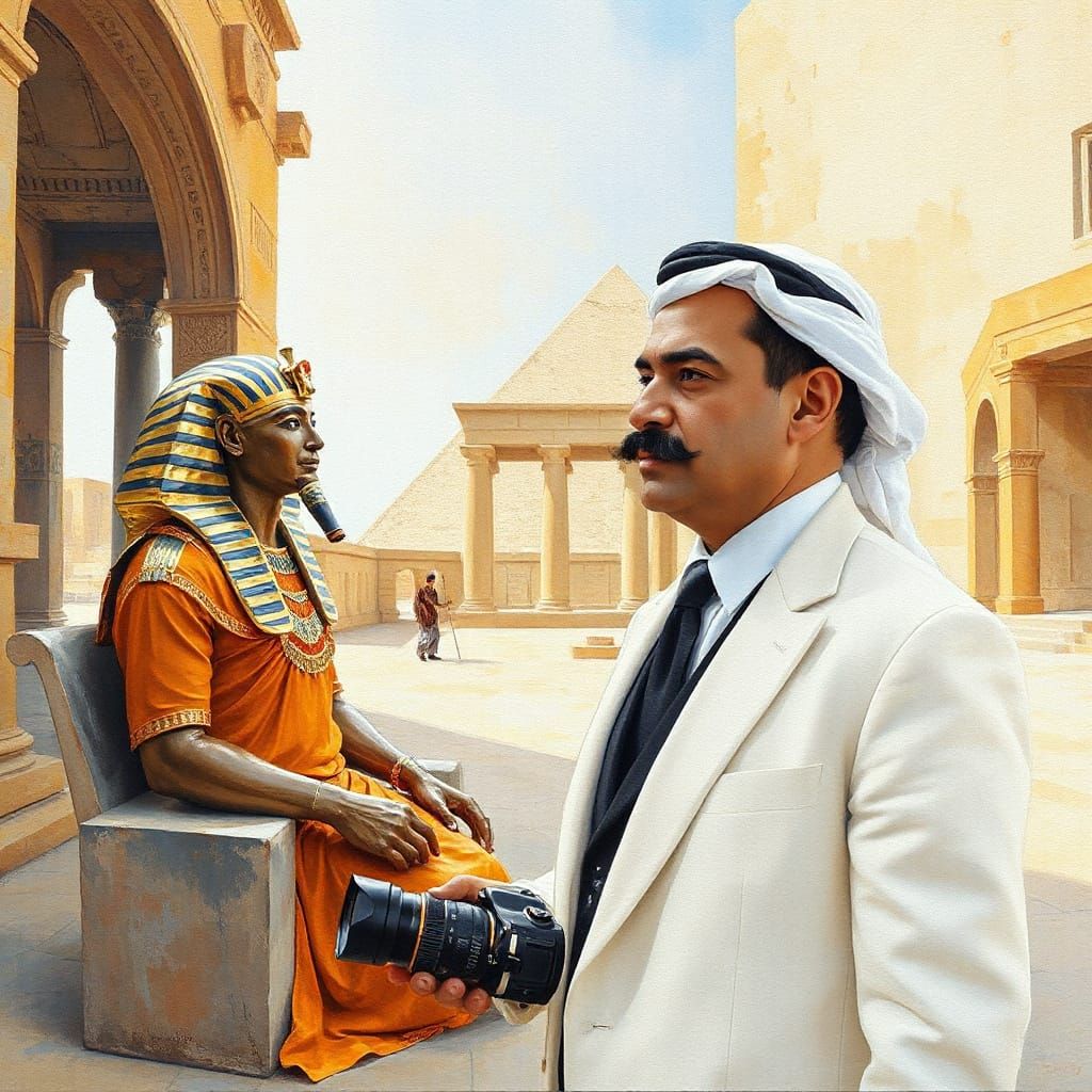 This image shows a modern Arab man in a white suit photographing a pharaoh in an ancient Egyptian palace. The scene is rendered with thick brush strokes and textured layers in a gouache and watercolor style.