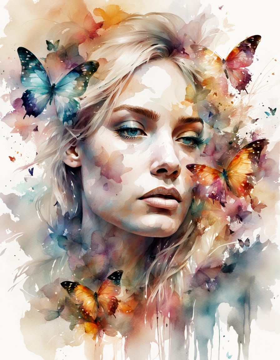 This image shows a beautiful, ethereal portrait of a blonde girl surrounded by colorful butterflies in mid-air, painted in a watercolor style with intricate details and warm colors.