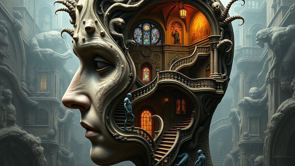 This image shows a human head split to reveal a surreal interior with Hieronymus Bosch-inspired creatures, Gothic carvings, and a serpentine staircase. The art style blends hyper-surrealism and fantasy with intricate, dreamlike details.