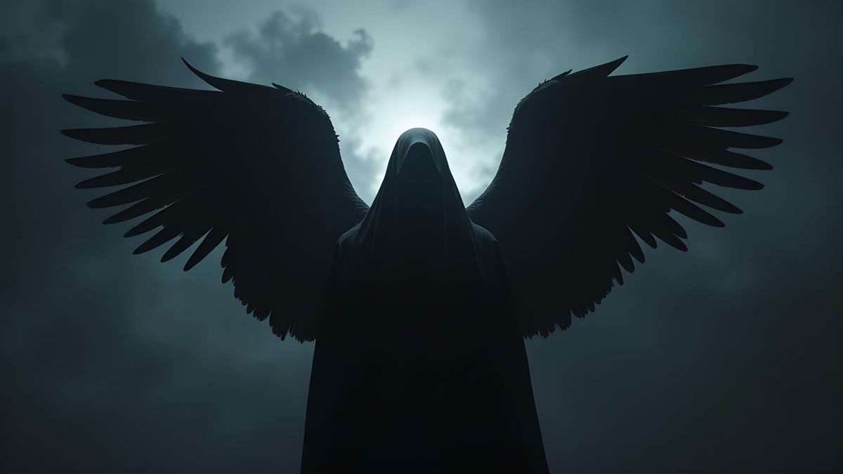 A dramatic image of a dark, faceless angel illuminated by a lightning strike against a brooding sky. The realistic rendering highlights the angel's details and the intense lighting effects.
