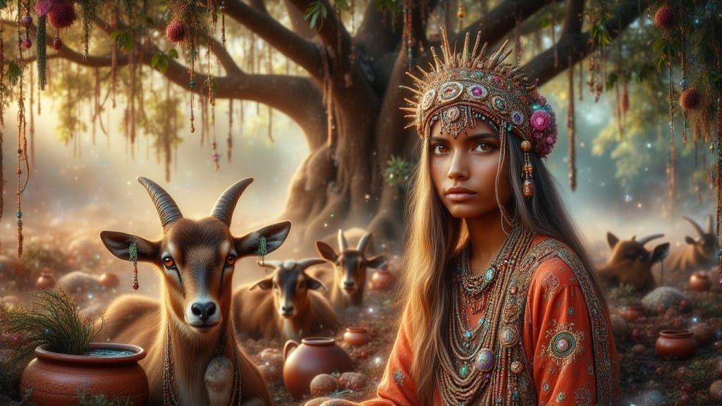 This image captures a young girl from Multan in traditional cultural dress, standing under a tree's dappled shade. Her warm complexion and vibrant attire reflect the region's rich heritage, while the peaceful atmosphere and rustic charm evoke the styles of Indian and Pakistani artists.
