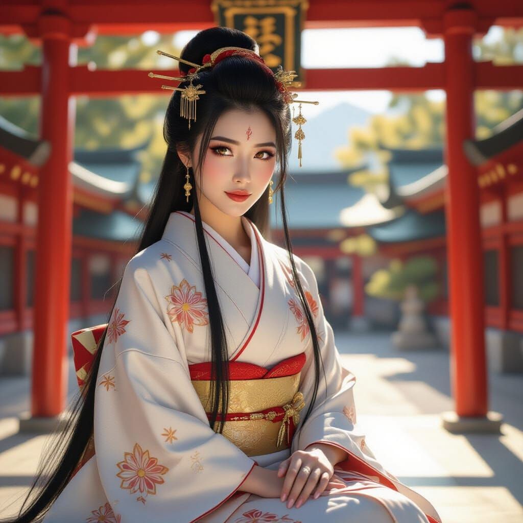 This image depicts the goddess Amaterasu in a traditional Shinto shrine. She is shown with long, dark hair, golden eyes, and wearing an elegant white and gold kimono, rendered with hyper-realistic detail.