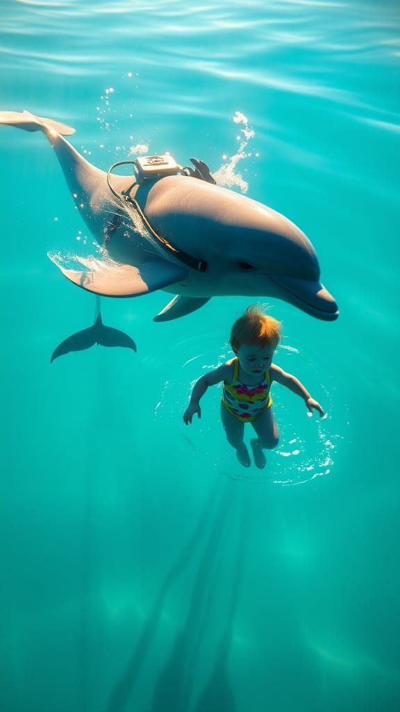 This image shows a dolphin wearing scuba gear guiding a baby in a swimsuit through clear turquoise water. Sunlight creates shimmering patterns, captured photorealistically with cinematic lighting and shallow depth of field.