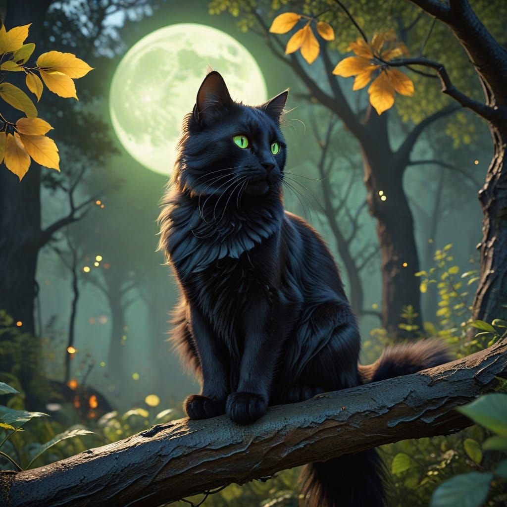 A striking picture of a black cat with long, wind-ruffled fur and jade green eyes. Perched on a tree branch in an enchanted forest, the cat gazes forward as fireflies glow around it.