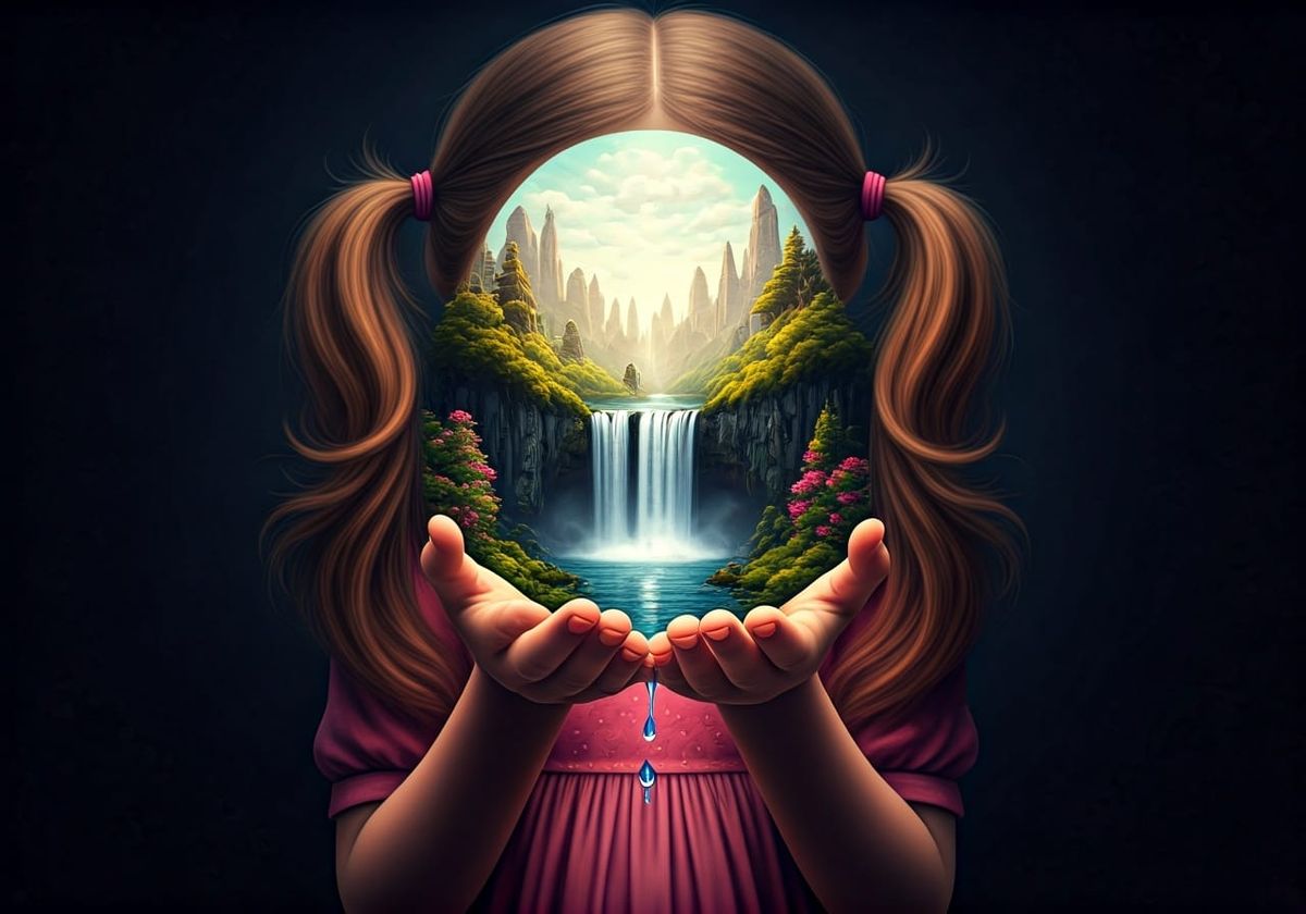 This image shows a girl with pigtails holding a miniature waterfall landscape in her cupped hands. The artwork blends fantasy and science fiction elements with abstract expressionism surrealism in a colorful and intricate style.