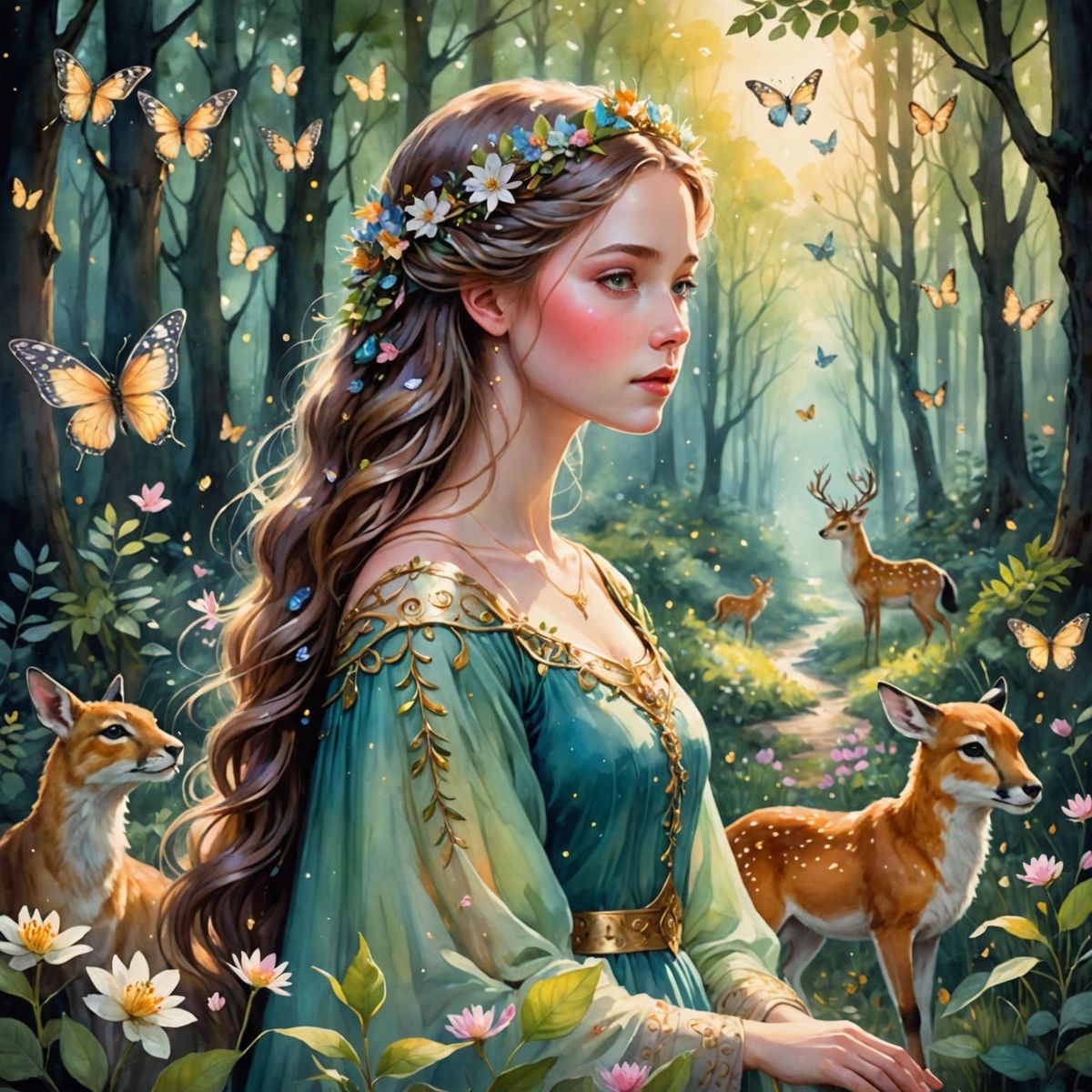This image shows a whimsical princess surrounded by animals in a forest, with flowers in her hair and soft, pastel colors throughout. Inspired by dreamy watercolor style and warm sunlight filtering through leaves.