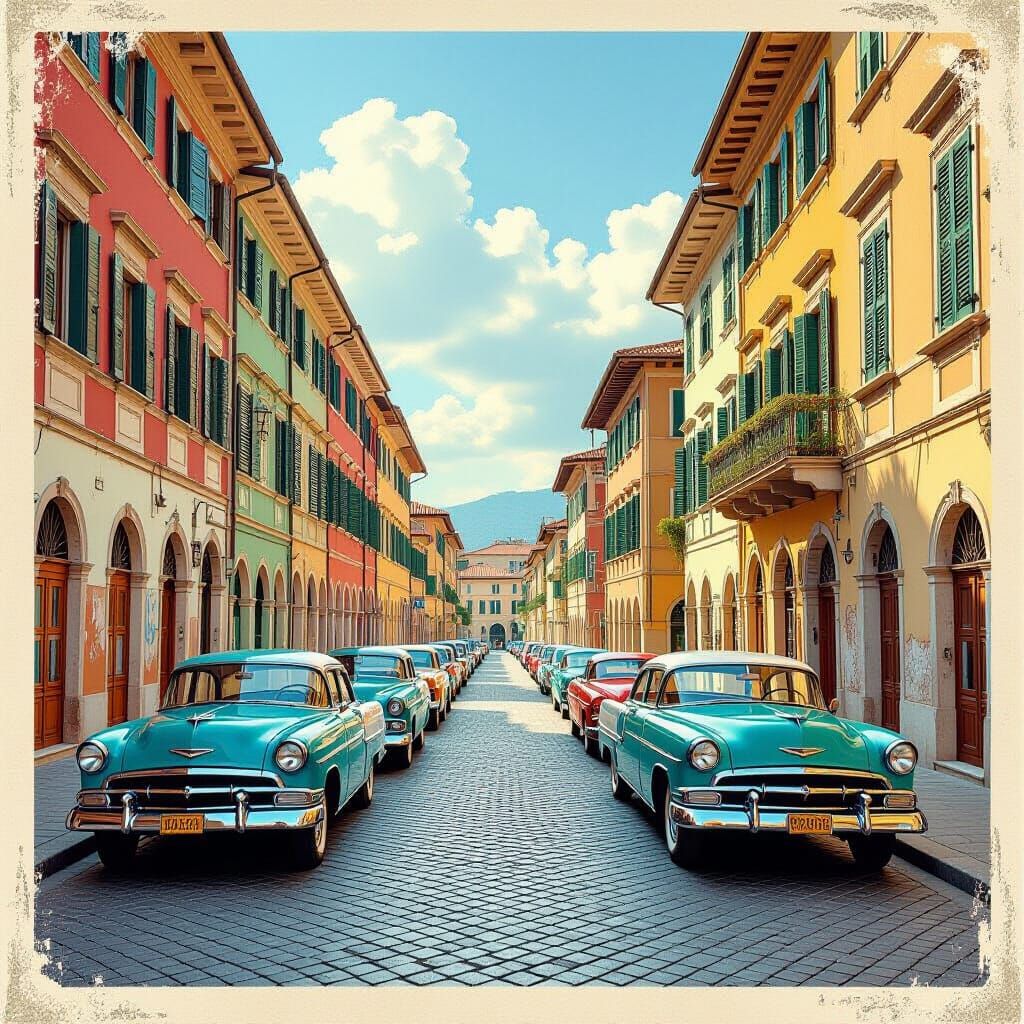 A photorealistic panoramic view of an old European street with vintage cars, presented as a faded, hand-colored print evoking mid-century travel nostalgia with vibrant, detailed golden hour lighting.