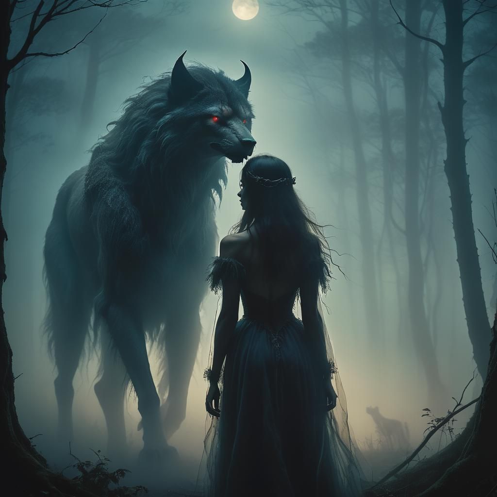A medium shot shows a maiden and beast in a moonlit forest. The image has a dark fantasy aesthetic, reminiscent of surrealist art. Ethereal light and rich textures create an eerie, haunting atmosphere.